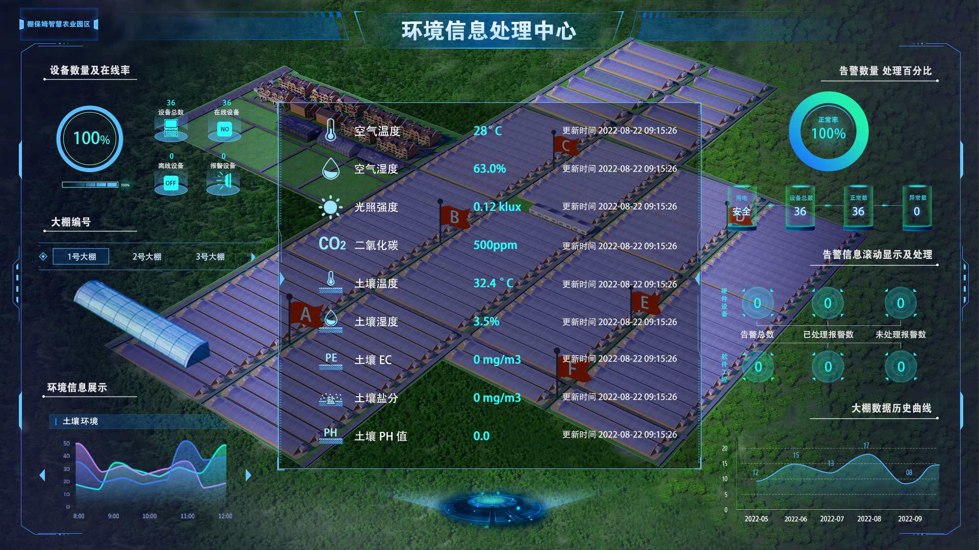 通過天地圖、虛擬園區、智能大棚等園區管理控制板塊,可以直觀立體的展示園區分布、大棚數量、種植面積以及物聯網設備在線等情況,并可以具體查看某個大棚的編號、建棚日期等基本信息以及棚內農作物的實時生長情況。